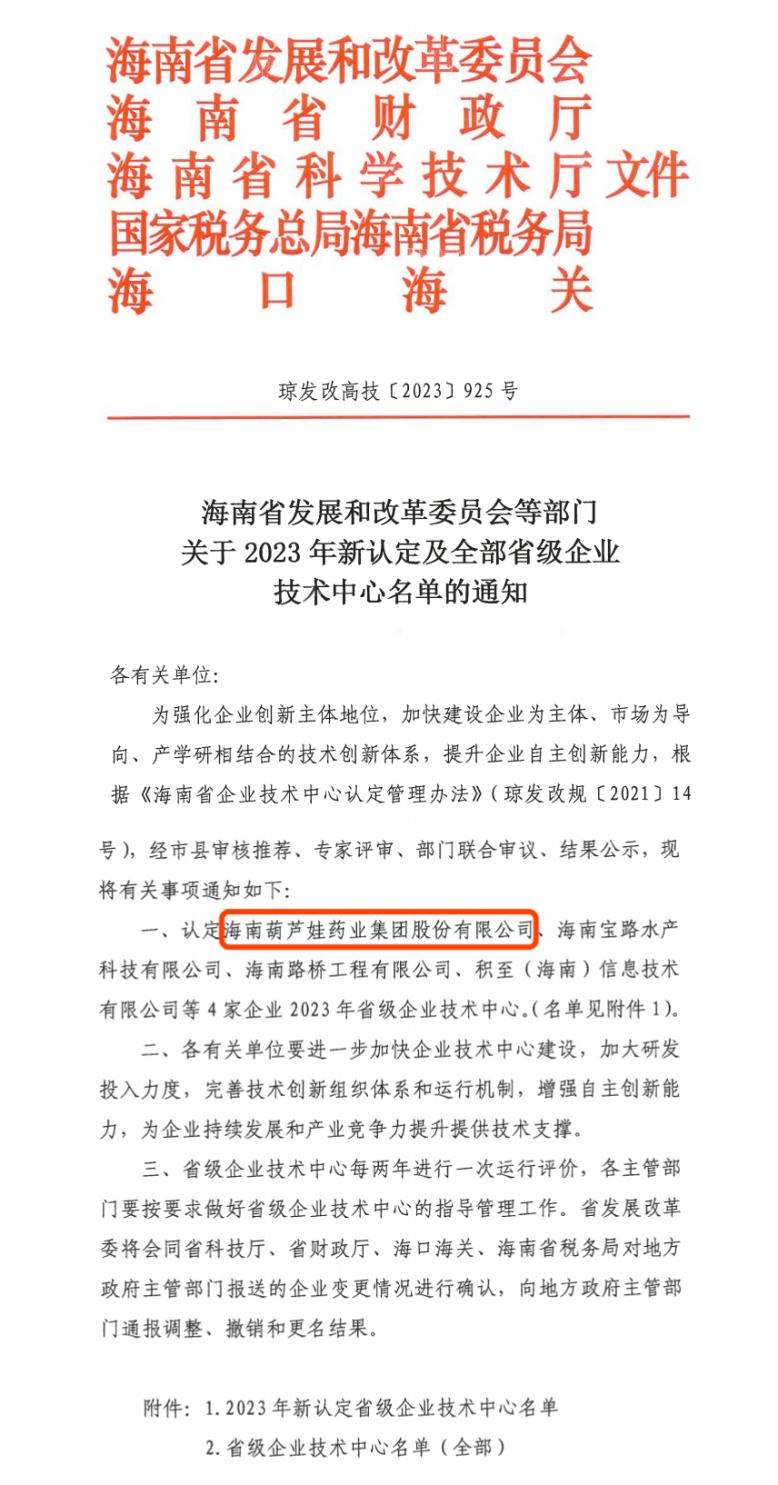 近日,海南省发改委等多部门联合公布了《关于2023年新认定及全部省级企业技术中心名单的通知》,其中,海南伟德国际1949药业集团股份有限公司成功通过评审,被认定为省级企业技术中心,是本次获批的4家企业之一。